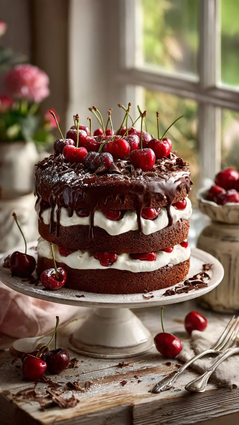 A classic dessert featuring rich chocolate cake, sweet cherries, and creamy whipped cream, perfect for special occasions.