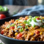 Cheesy Taco Rice Skillet is a delicious, quick, and easy meal that brings the flavors of taco night to your kitchen in just one pan. It saves time on cleanup and is perfect for busy weeknights. This dish combines ground beef, beans, corn, and cheesy goodness all in one skillet, making it a family favorite. Plus, it’s a great way to use pantry staples and keep everyone satisfied!