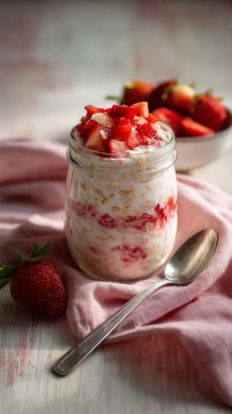 Delicious and nutritious overnight oats with creamy texture and sweet strawberry flavor, suitable for various dietary needs.