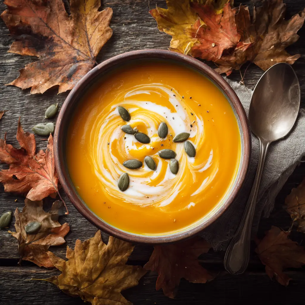It’s made with roasted butternut squash, pumpkin puree, apple juice or cider, carrots, vegetable broth, and a mix of warming spices. Cream cheese and heavy cream give it that rich, silky finish.