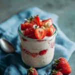 A delicious and healthy breakfast option made with oats, yogurt, and fresh strawberries, perfect for busy mornings.